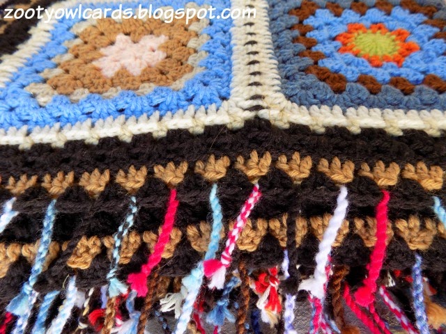 Use the remainder of the scraps to measure out and cut lengths of yarn for the braids (I just wound them around an emery board and then cut through the top and bottom end). Add a BRAID between each granny cluster!