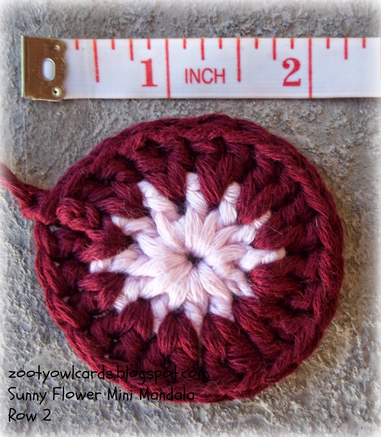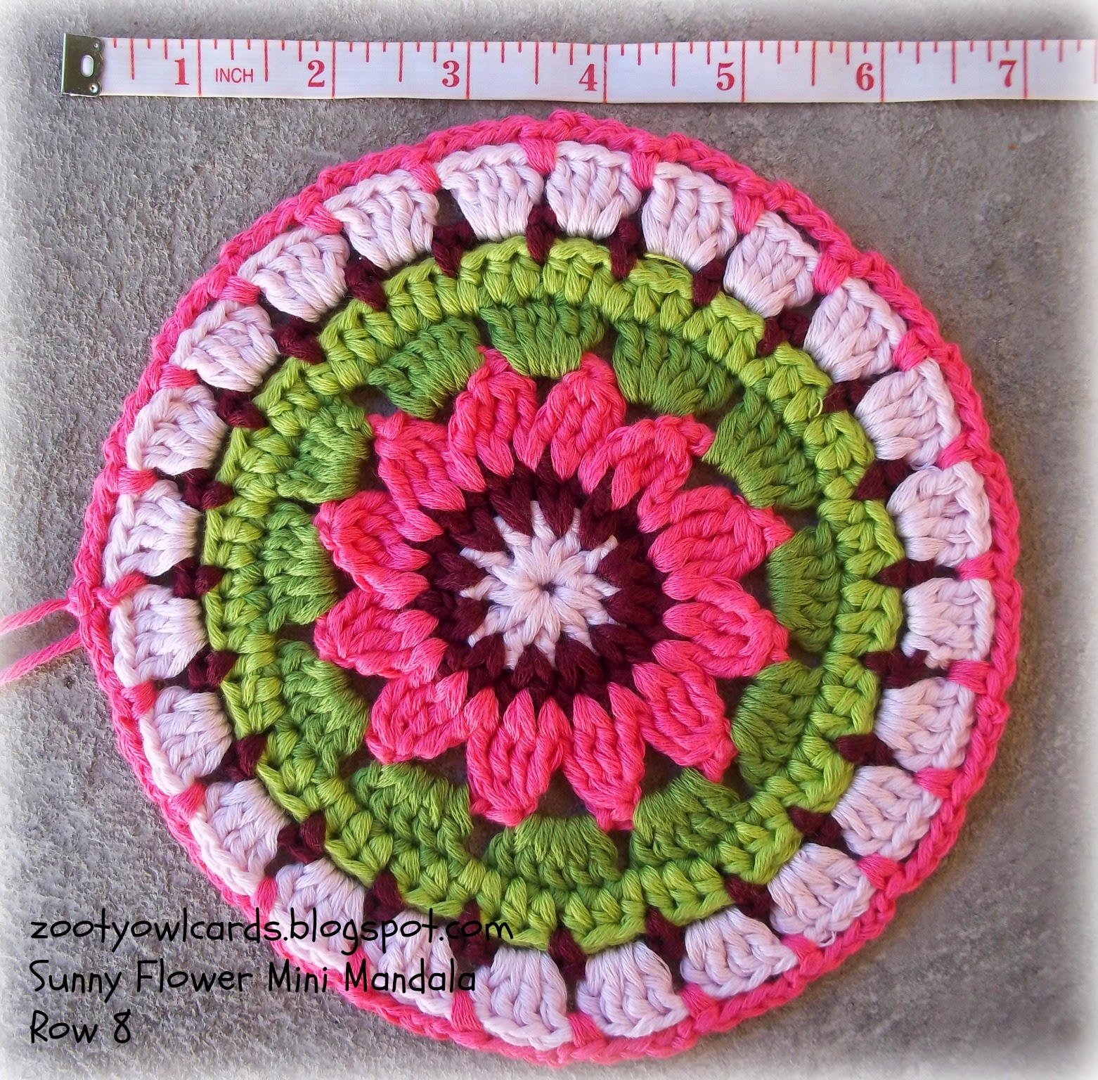 I have provided row by row photos and explanations for the Sunny Flower Mini Mandala HERE